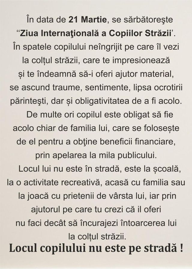 Aceste acțiuni au drept consecință menținerea copiilor în aceeași stare de degradare socială și morală care le afectează dramatic copilăria și le limitează șansele la o viață decentă.